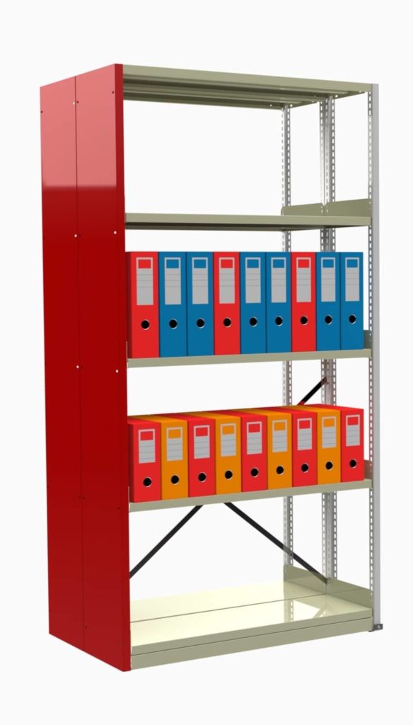 Des rayonnages tôlés pour le stockage manuel de produits légers sur étagères métalliques avec tablettes, par exemple : boites archives, dossiers suspendus, petites pièces en vrac, bacs de rangement, etc…
